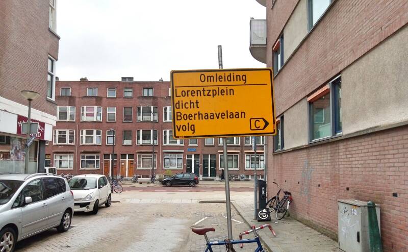 12 oktober - PKO-laan weer bereikbaar via Spoorstraat, het omleidingsbord in de Teylerstraat.